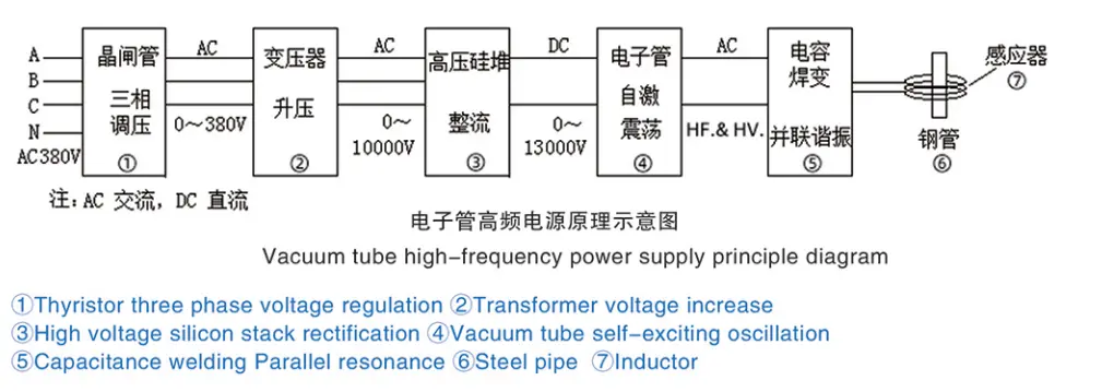 Вообичаената индустриска наизменична струја (трифазни четири жици 380V/50HZ во Кина) се претвора во прилагодлива наизменична струја која се движи од 0 до 380V (фреквенцијата непроменета) преку регулаторот за наизменичен напон на тиристор, а потоа се зголемува до скоро 10000V висок напон, а потоа се менува со висока фреквенција (висока фреквенција) Коло за исправување на напон до десетици илјади DC висок напон, а потоа осцилирано со вакуумска цевка до HF и HV струја, а потоа преку LC паралелна резонанца за засилување на осцилирачката струја, а по намалувањето на напонот снабдување со индуктор што се користи за загревање на челични цевки и други работни парчиња итн.