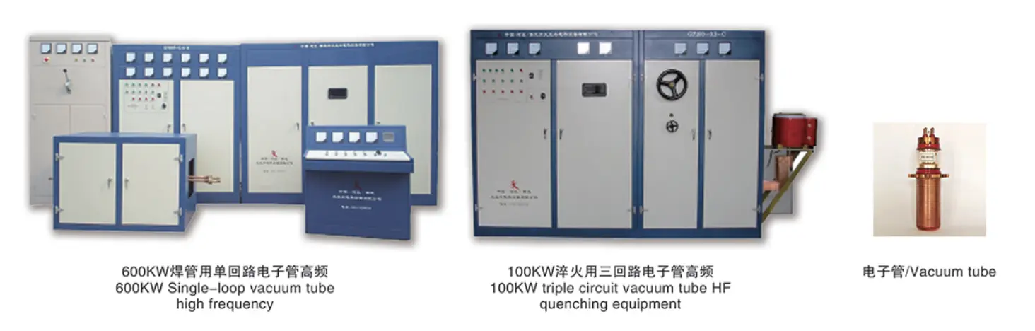Фотографиите подолу се опрема за гаснење на вакуумска цевка со единечна јамка од 600KW со висока фреквенција и 100KW трокреветна вакуумска цевка HF за гаснење.