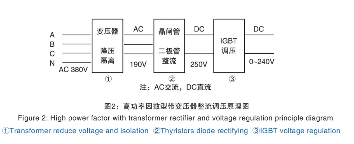 1. Класифицирани со исправувачка регулација на напонот: Тиристорите (SCR) може да се користат за да се заврши истовремената исправка и регулацијата на напонот, или прво да се користи диода или тиристори за исправување, а потоа да се користи IGBT регулирање на напонот. Користете го регулираниот напон на IGBT за подобрување на факторот на опремата. може да заштеди електрична енергија и дополнително да го подобри квалитетот на заварувањето.
